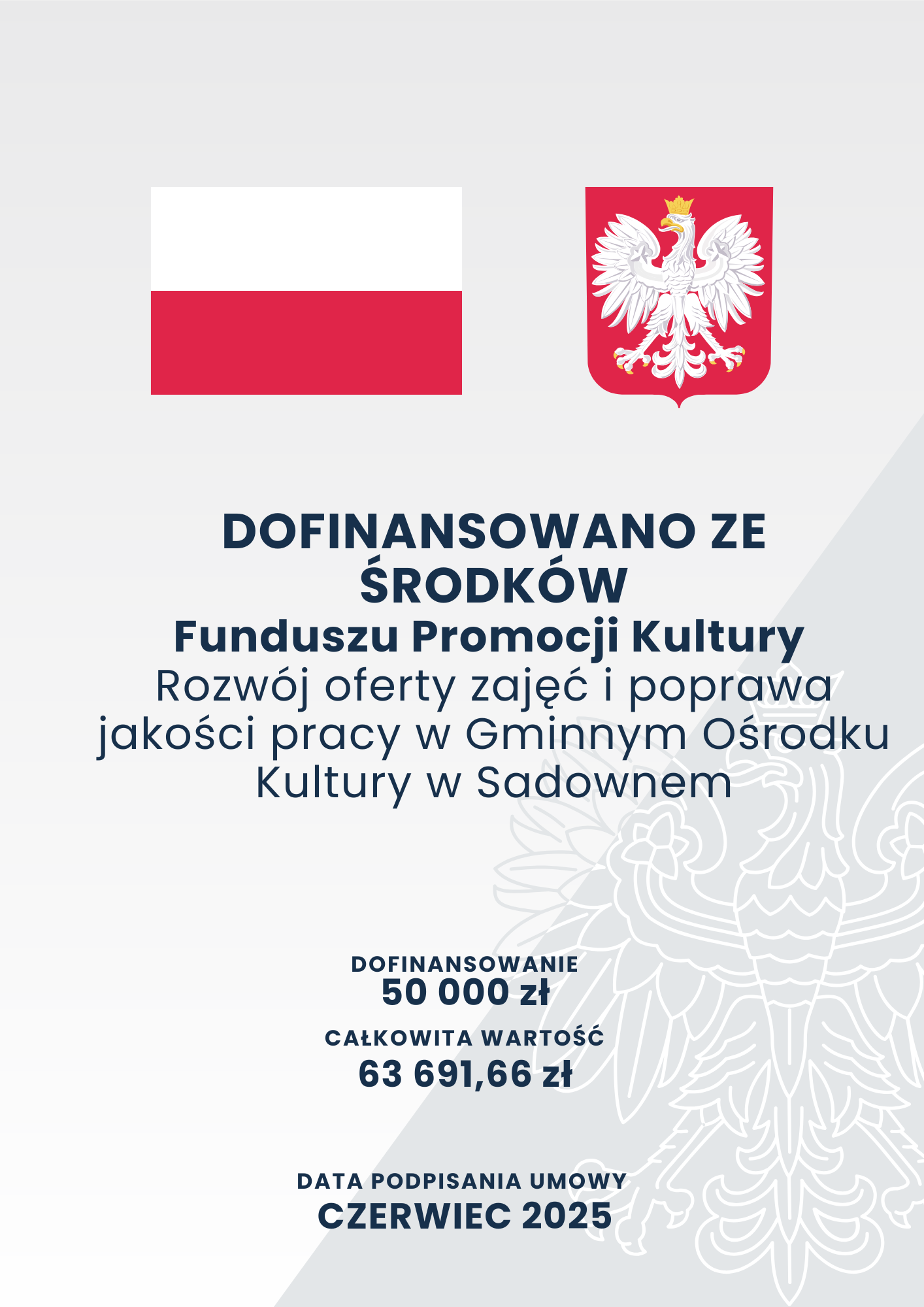 Gminny Ośrodek Kultury w Sadownem otrzymał dofinansowanie w wysokości 50 000 zł (całkowity koszt zadania wynosi 63 691,66 zł). Środki pochodzą z Funduszu Promocji Kultury pozostającego w dyspozycji Ministra Kultury i Dziedzictwa Narodowego. Dotacja została przyznana na realizację zadania pn. „Rozwój oferty zajęć i poprawa jakości pracy w Gminnym Ośrodku Kultury w Sadownem” w ramach rządowego programu „Infrastruktura domów kultury 2025”.