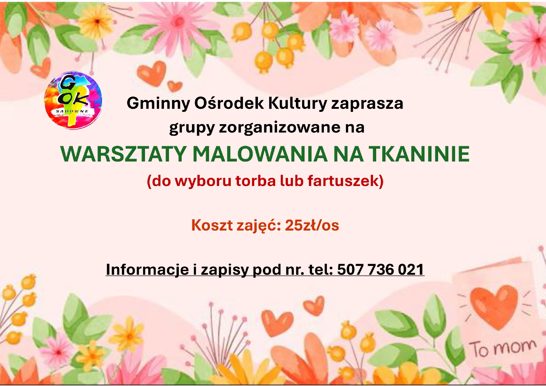 WARSZTATY MALOWANIA NA TKANINIENie masz pomysłu na prezent dla swojej mamy?Chcesz zrobić coś samodzielnie?Zapraszamy grupy zorganizowane na warsztaty malowania na tkaninie! |