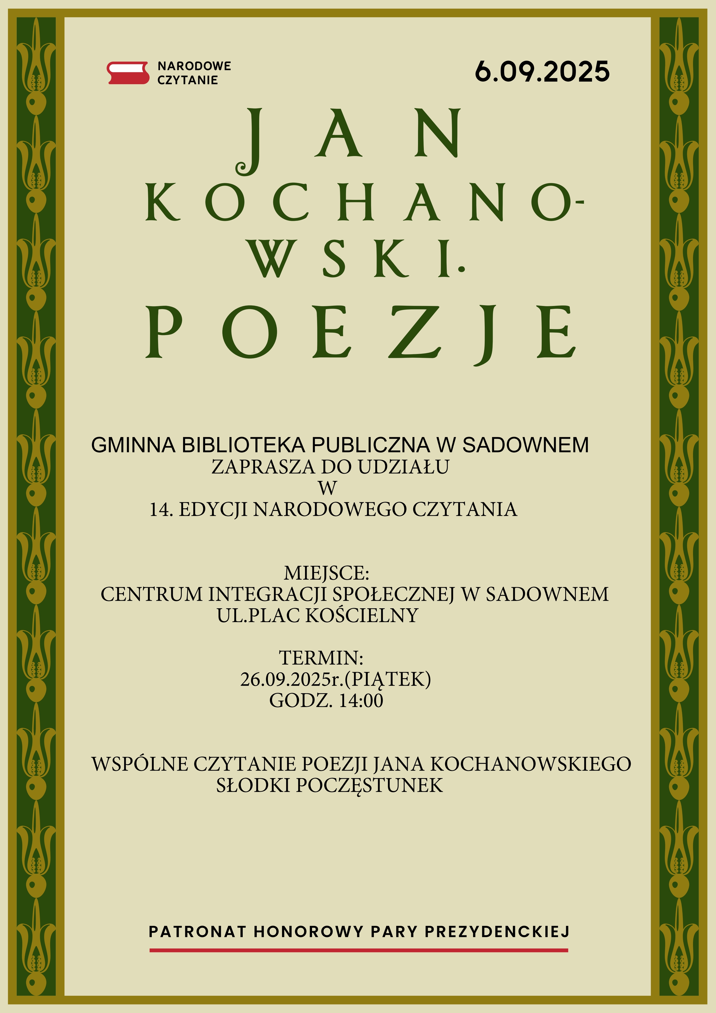 Gminna Biblioteka Publiczna w Sadownem zaprasza do udziału w 14. edycji akcji Narodowe Czytanie. W tym roku wspólnie sięgamy po utwory Jana Kochanowskiego.