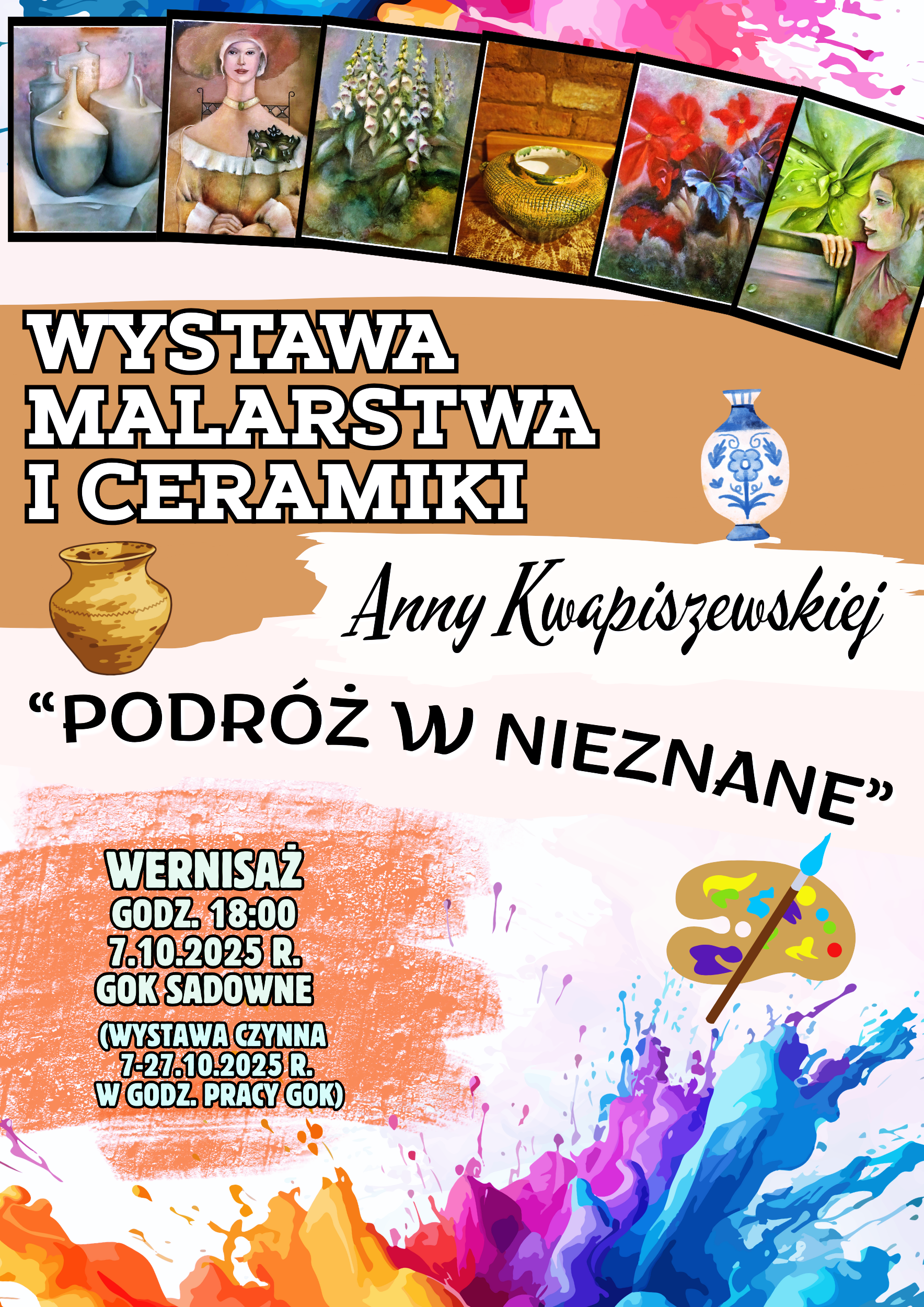 Gminny Ośrodek Kultury w Sadownem zaprasza na wystawę prac Anny Kwapiszewskiej, łączącą malarstwo i ceramikę. Ekspozycja prowadzi widza w „podróż w nieznane” – pełną koloru, faktur i nastrojowych opowieści.
