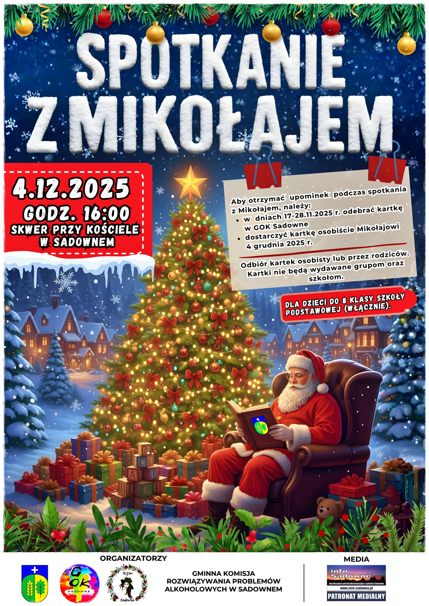 Świąteczna przygoda tuż za rogiem! 4 grudnia o 16:00 Mikołaj ląduje na skwerze przy kościele w Sadownem !!!